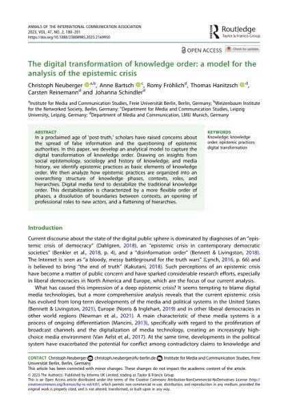 - ItemThe digital transformation of knowledge order: a model for the analysis of the epistemic crisis(2023) Neuberger, Christoph; Bartsch, Anne; Fröhlich, Romy; Hanitzsch, Thomas; Reinemann, Carsten; Schindler, JohannaIn a proclaimed age of ‘post-truth,’ scholars have raised concerns about the spread of false information and the questioning of epistemic authorities. In this paper, we develop an analytical model to capture the digital transformation of knowledge order. Drawing on insights from social epistemology, sociology and history of knowledge, and media history, we identify epistemic practices as basic elements of knowledge order. We then analyze how epistemic practices are organized into an overarching structure of knowledge phases, contexts, roles, and hierarchies. Digital media tend to destabilize the traditional knowledge order. This destabilization is characterized by a more flexible order of phases, a dissolution of boundaries between contexts, an opening of professional roles to new actors, and a flattening of hierarchies.