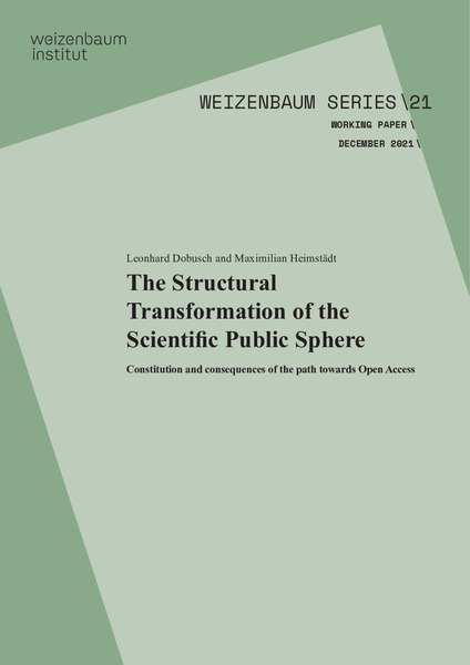 - ItemThe Structural Transformation of the Scientific Public Sphere: Constitution and consequences of the path towards Open Access(Weizenbaum Institute, 2021) Dobusch, Leonhard; Heimstädt, MaximilianWe are currently witnessing a fundamental structural transformation of the scientific public sphere, characterized by processes of specialization, metrification, internationalization, platformization, and visibilization. In contrast to explanations of this structural transformation that invoke a technological determinism, we demonstrate its historical contingency by drawing on analytic concepts from organization theory and the case of the Open Access transformation in Germany. The digitization of academic journals has not broadened access to scientific output but narrowed it down even further in the course of the “serials crisis”. For a long time, research institutions were not able to convince large academic publishers to adopt less restrictive forms of access to academic journals. It was only through the emergence of new and in part illegal actors (shadow libraries and preprint servers) that the existing path could be broken, and an Open Access path constituted. Following this analysis, we discuss consequences of the Open Access transformation for the public spheres of science and democracy. We conclude that Open Access publishing can only help to transform both communicative spaces towards the normative ideal of a public sphere when complemented by systematic support for non-profit publication infrastructures.